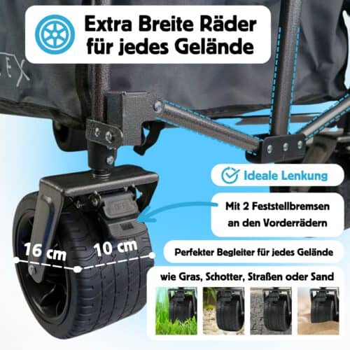 Mit extra breiten Räder ist er ideal für Wanderungen, Wochenendausflüge, Reisen und viel mehr. Es bleibt Ihnen überlassen, wohin Sie ihn mitnehmen, denn zusammengeklappt ist er kompakt und platzsparend, aufgebaut transportiert er, Ihre schweren und sperrigen Sachen und erleichtert Ihnen das Leben enorm.